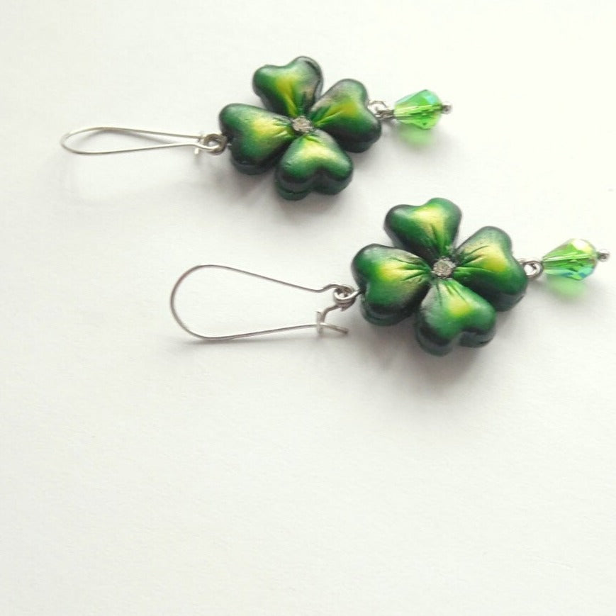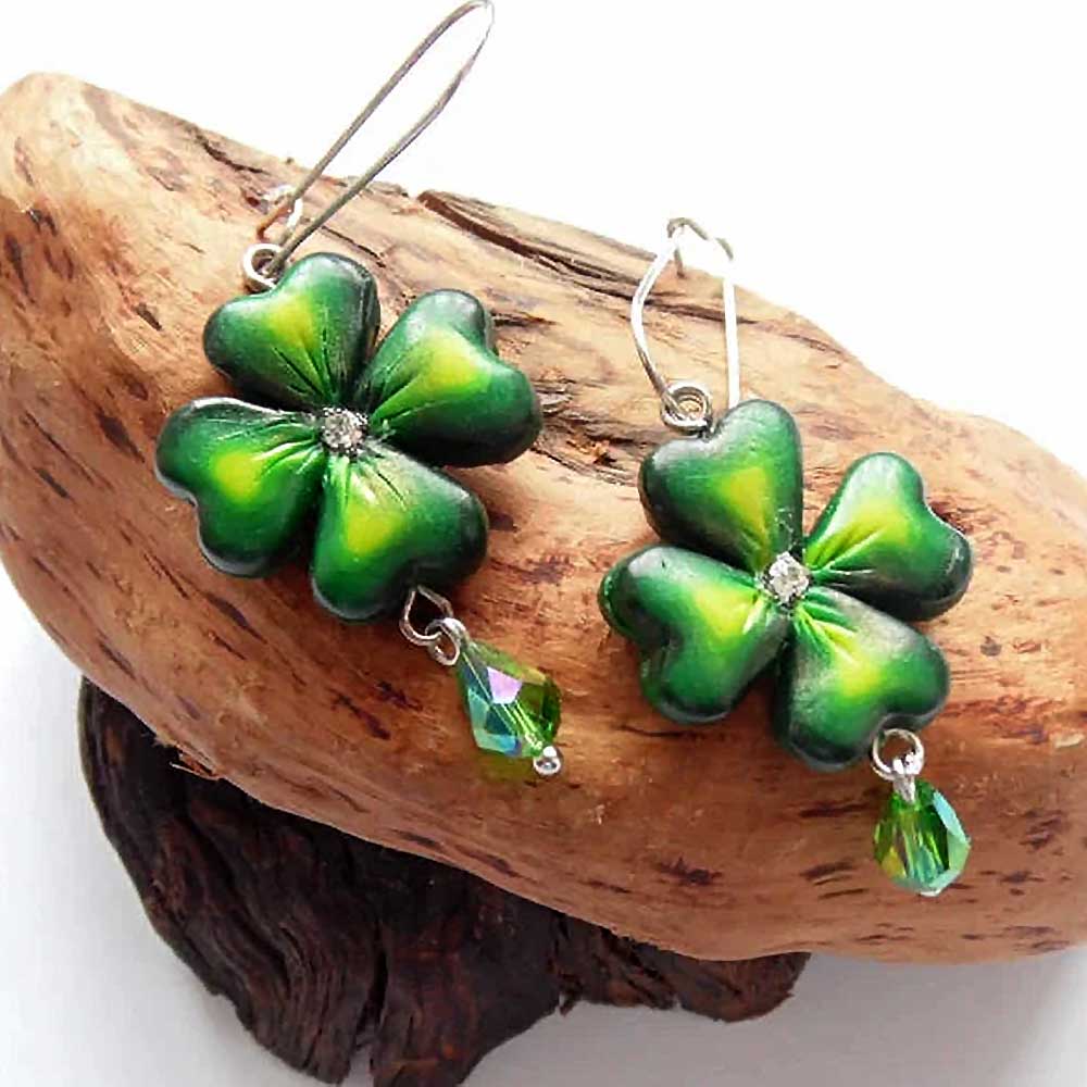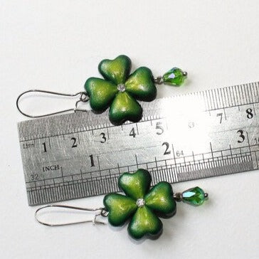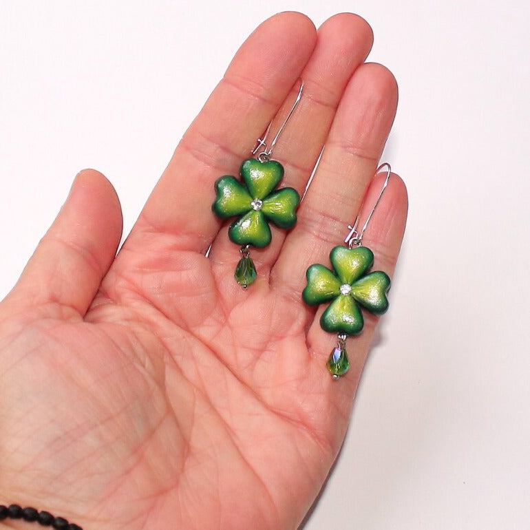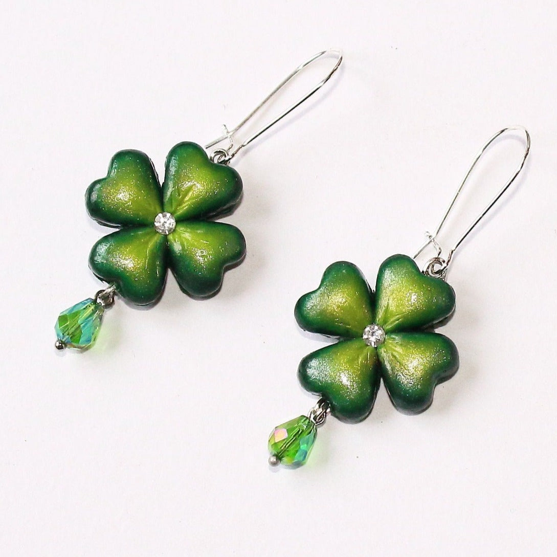 A charming symbol of good luck and prosperity, the Clover Earrings are perfect for adding a little sparkle to your outfit. Made of polymer clay, the Lucky Four Leaf design features a smooth color transition that gives the earrings a unique look. The crystals in the center of the leaf sparkle brightly in both sunlight and artificial light. A light PearlEX toning gives the leaf a glow from within. These earrings, complemented with a green drop bead with an iridescent hue, will bring a touch of good luck to your day. If you're looking for a unique accessory for yourself or a thoughtful gift for a loved one, these Clover earrings are just the thing. Shine brighter and attract good luck with these unique earrings that will become your lucky accessory!