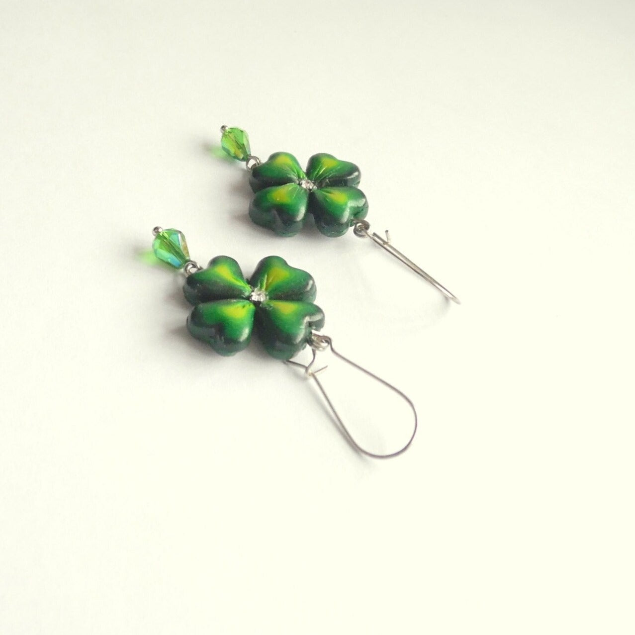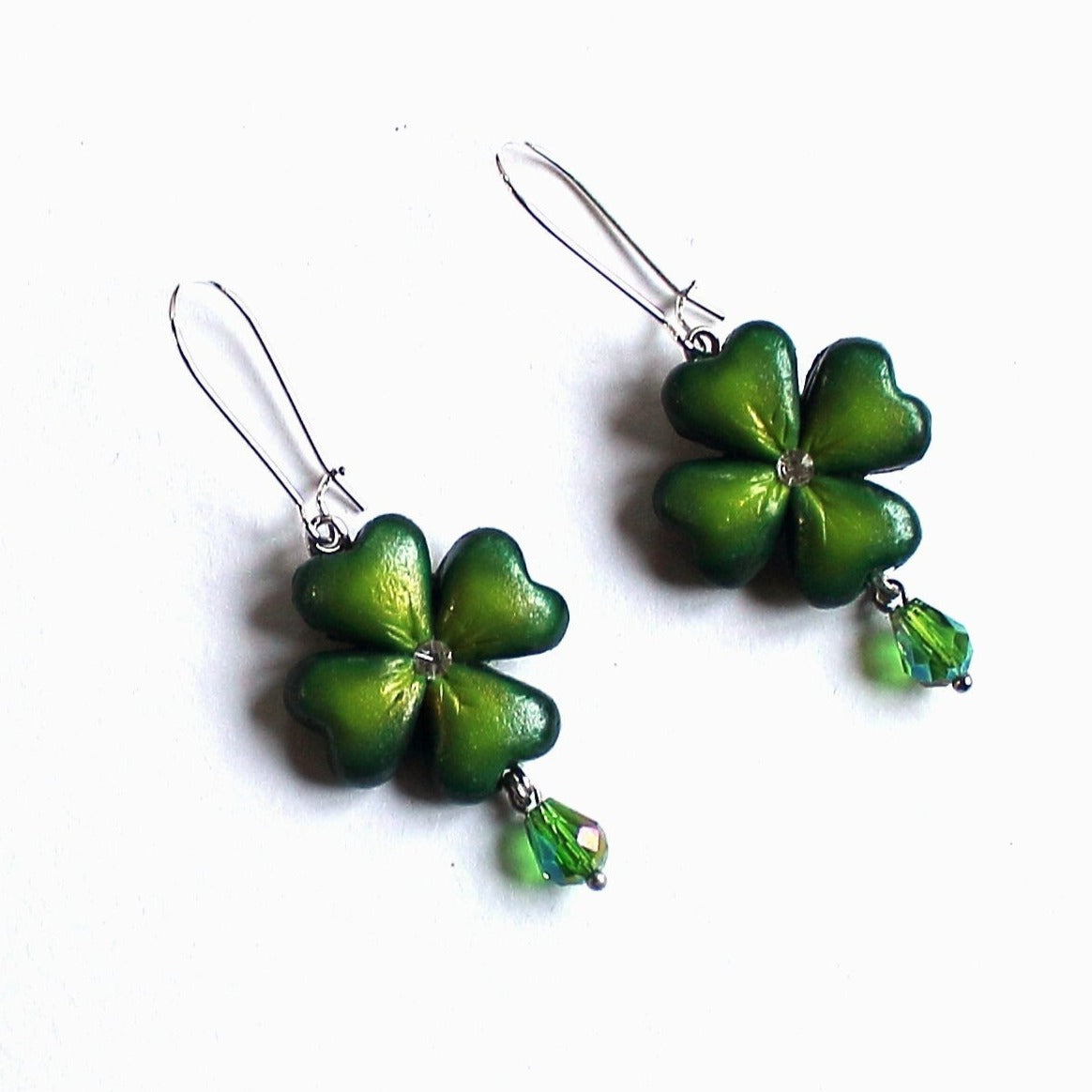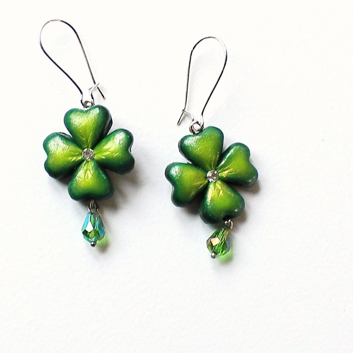 A charming symbol of good luck and prosperity, the Clover Earrings are perfect for adding a little sparkle to your outfit. Made of polymer clay, the Lucky Four Leaf design features a smooth color transition that gives the earrings a unique look. The crystals in the center of the leaf sparkle brightly in both sunlight and artificial light. A light PearlEX toning gives the leaf a glow from within. These earrings, complemented with a green drop bead with an iridescent hue, will bring a touch of good luck to your day. If you're looking for a unique accessory for yourself or a thoughtful gift for a loved one, these Clover earrings are just the thing. Shine brighter and attract good luck with these unique earrings that will become your lucky accessory!