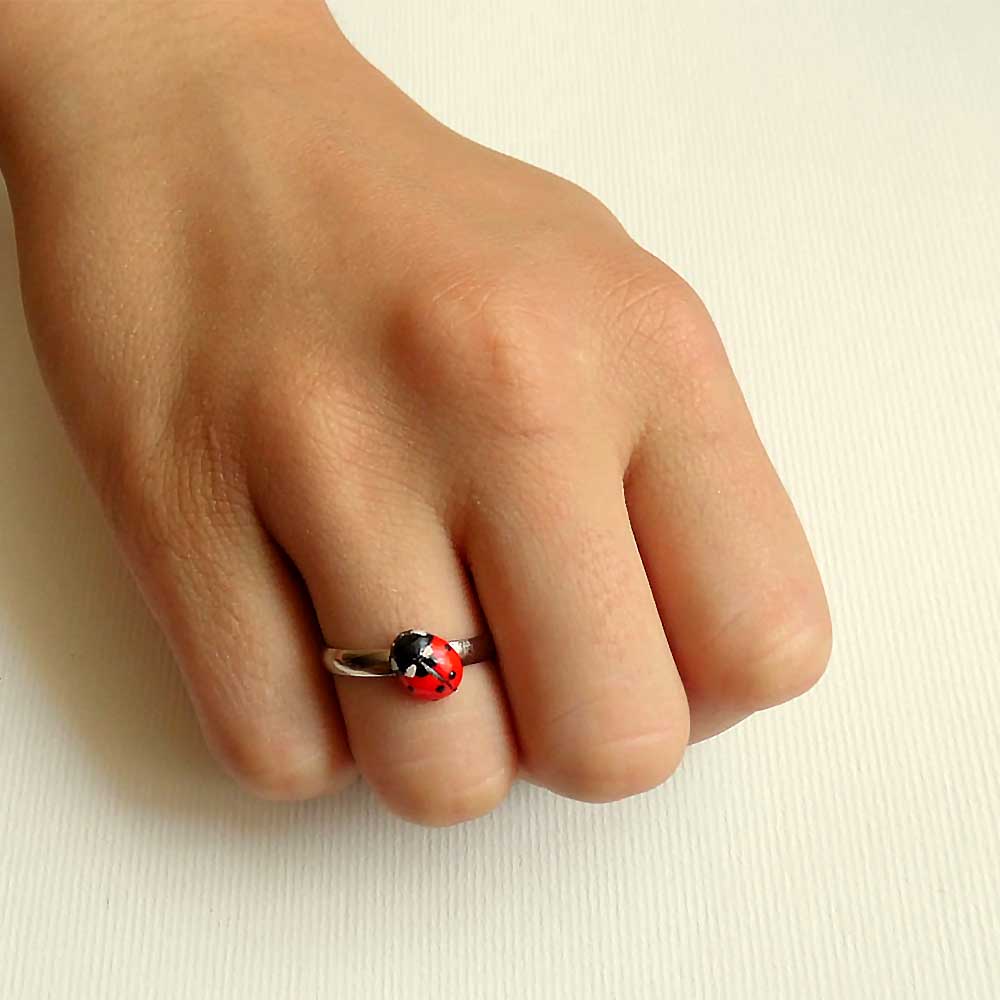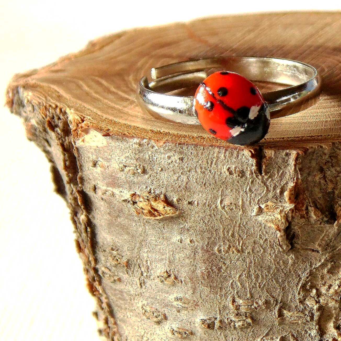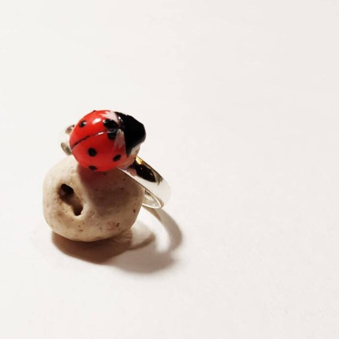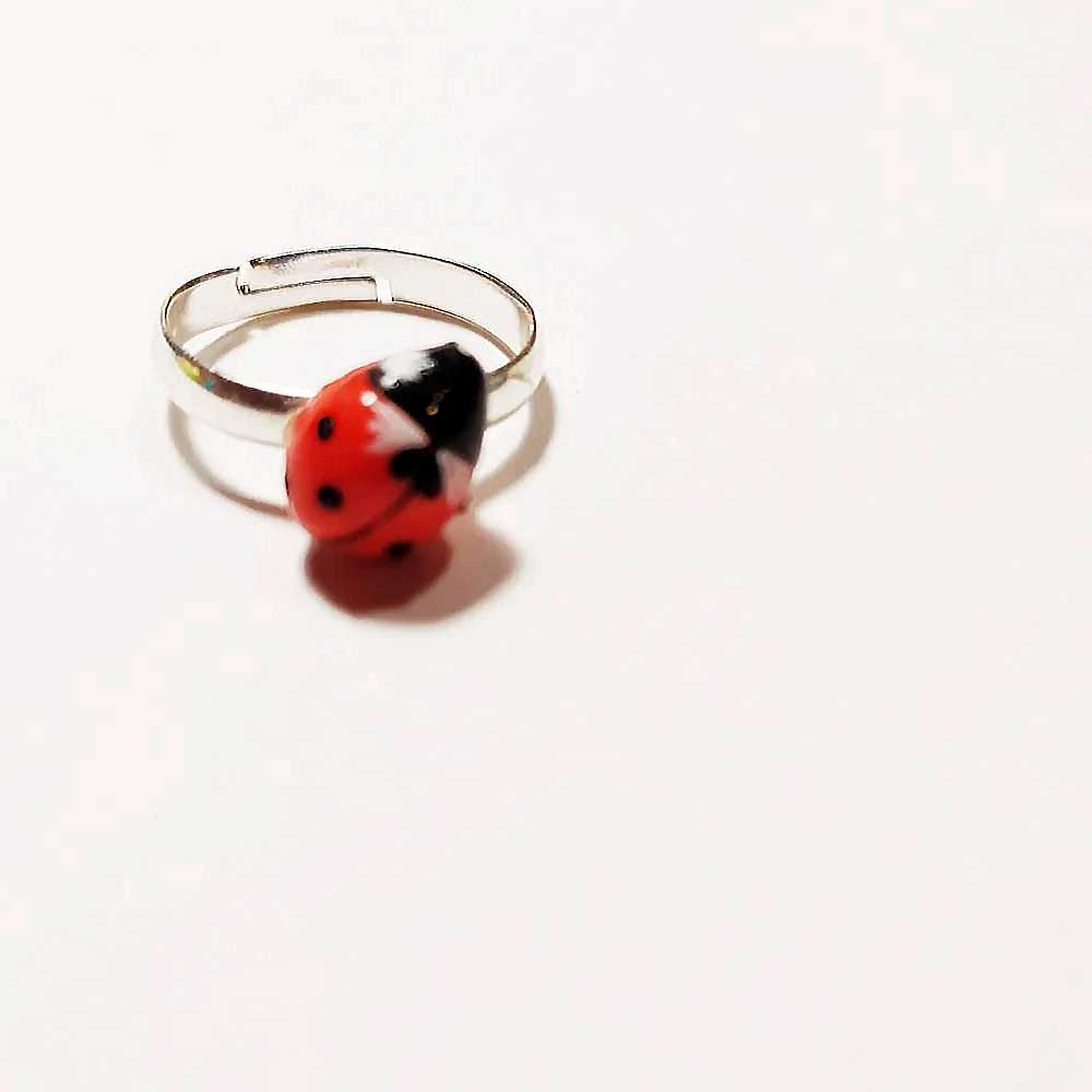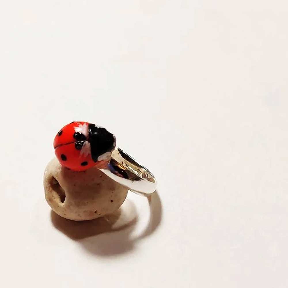 This skillfully handcrafted Ladybug Ring showcases the beauty of handmade products. The artist forms each ladybug in this ring of polymer clay without the use of special molds or molds. This makes each piece unique.