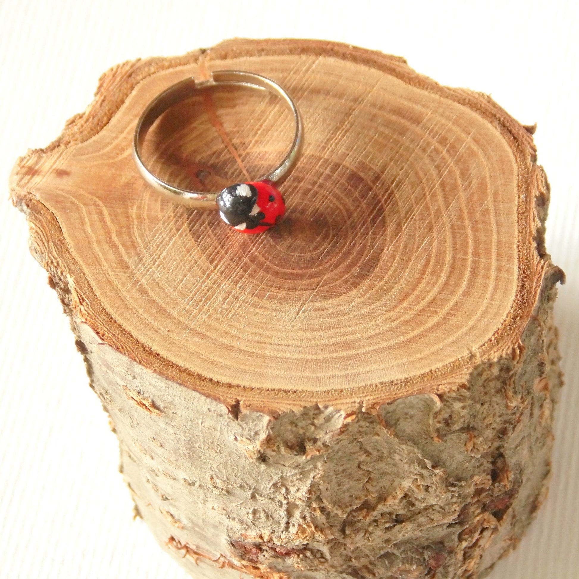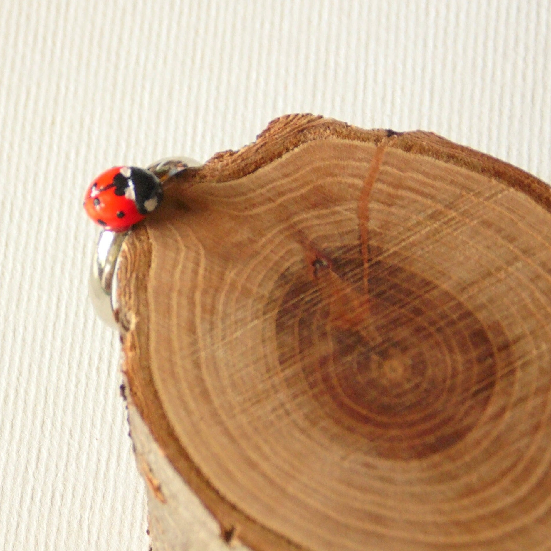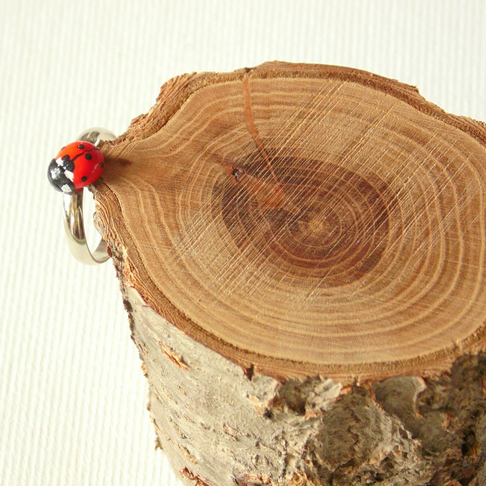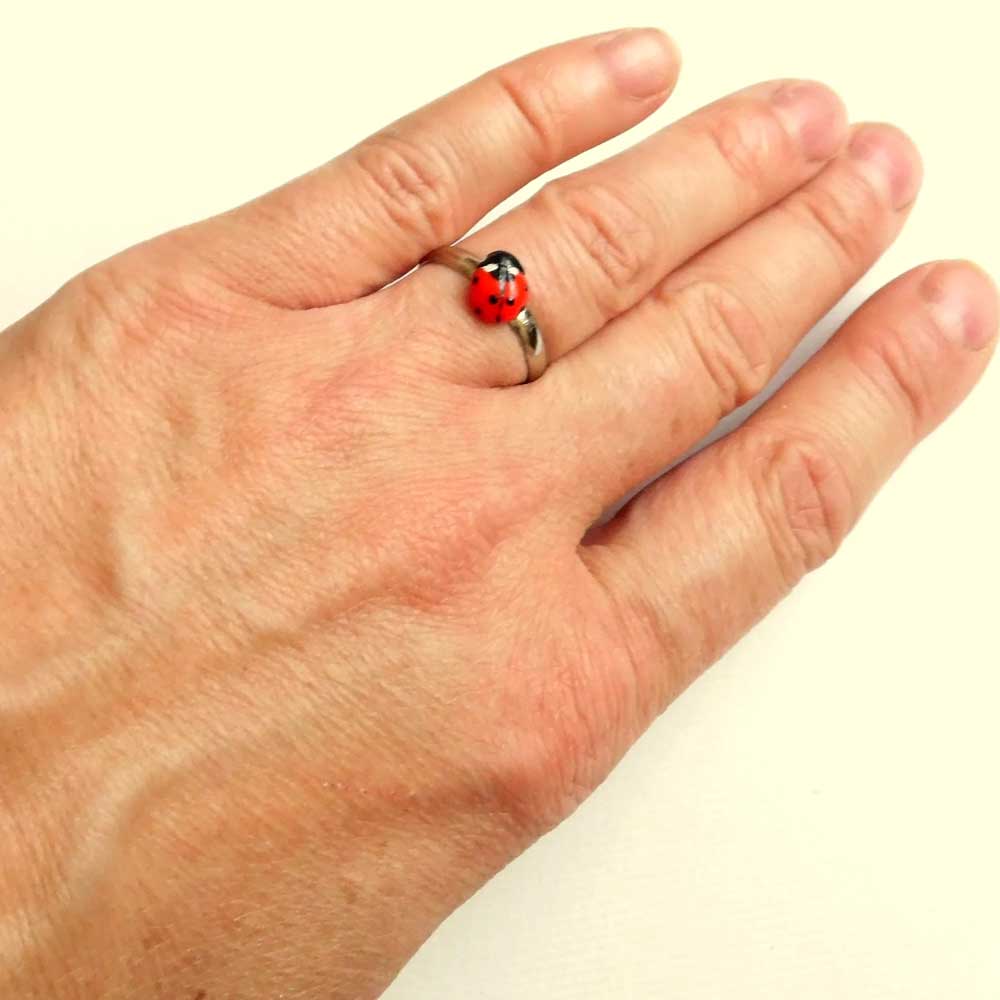 This skillfully handcrafted Ladybug Ring showcases the beauty of handmade products. The artist forms each ladybug in this ring of polymer clay without the use of special molds or molds. This makes each piece unique.