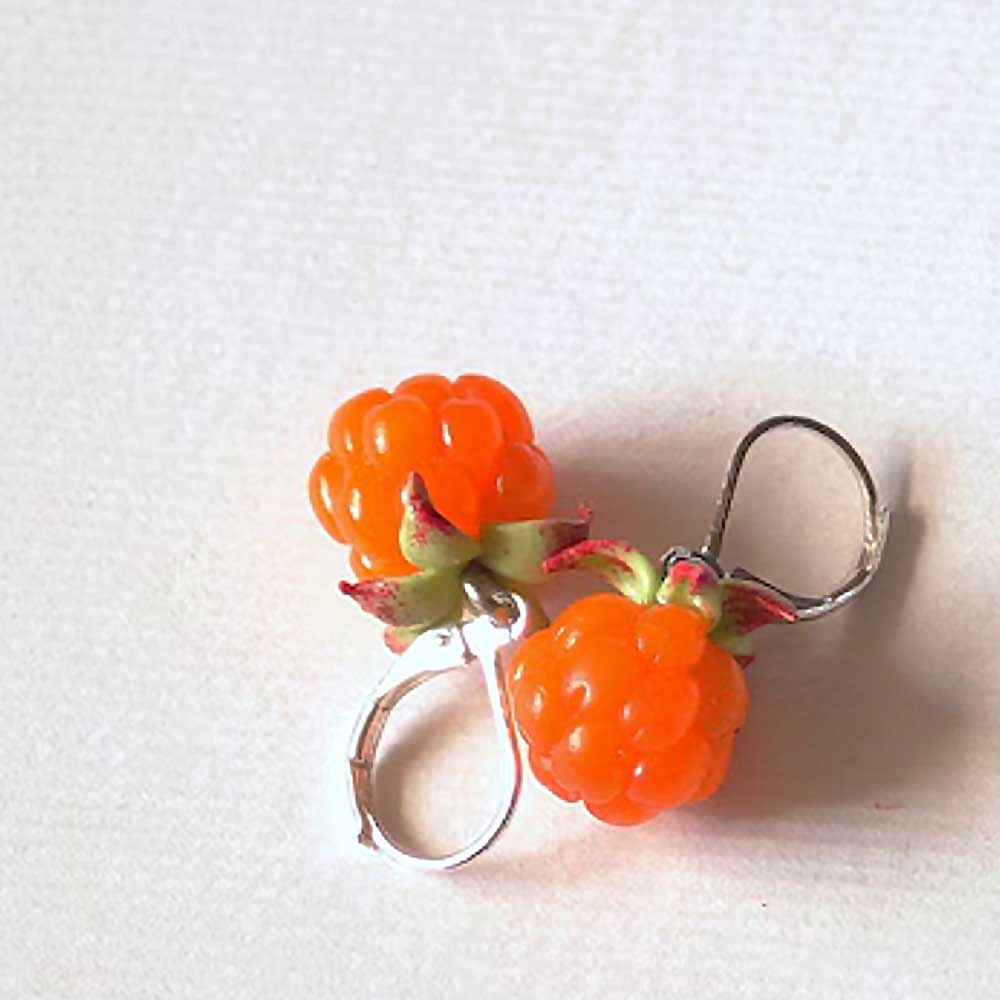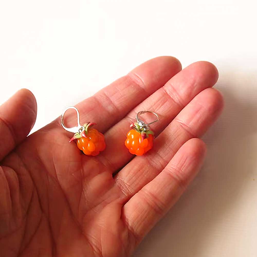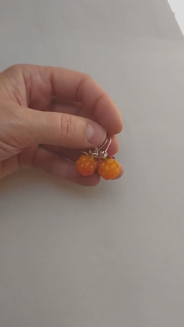 Meet our gorgeous Northern Delight: Cloudberry Earrings. They exemplify the craftsmanship and fine art required to create an elegant, one-of-a-kind piece of jewelry. The earrings are handcrafted with precision from translucent polymer clay, shaped to resemble the delicate and colorful fruit of the cloudberry. The attention to detail is truly extraordinary. Each imitation cloudberry perfectly embodies its natural counterpart. The design of these earrings is clearly calibrated, emphasizing the beauty of the cloudberries. The hooks are available in two options: sterling silver or simply silver plated, both of which promise durability and class. Whether you're going to a fancy event or just want to add grace to your everyday outfit, choose the Cloudberry Earrings. These earrings speak luxury and fashion with their realistic cloudberry design and flawless artistry.
