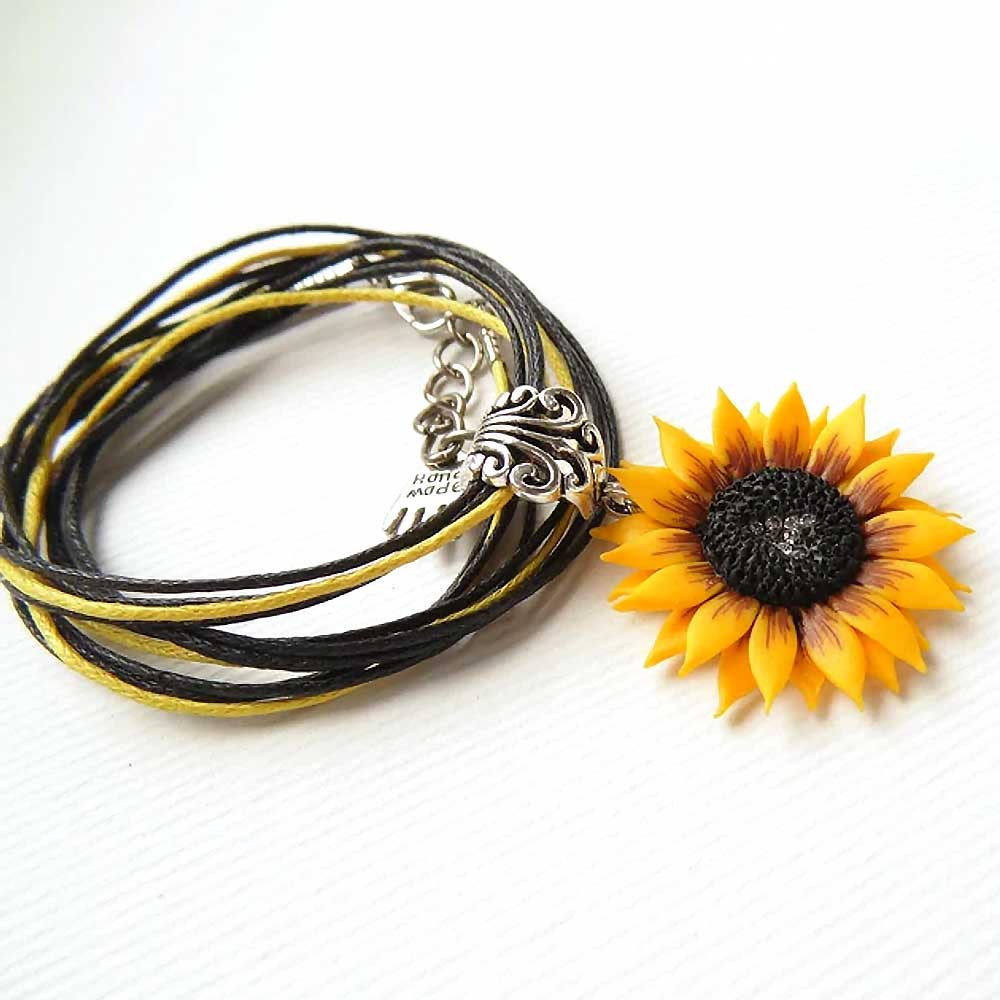 Enjoy the beauty of nature with our Your Symbol: Initial Sunflower Necklace, which expertly blends artistic skill and a personal touch. Made of quality polymer clay, each sunflower is meticulously hand molded to create a truly unique piece. The bright yellow petals radiate warmth and cheerfulness, while the beautifully detailed seeds give them a realistic feel. At the heart of the flower, shining rhinestones form your initials, making this necklace a truly unique and meaningful accessory. The necklace's robust black and yellow cord transforms from merely an eye-catching piece of jewelry to a jewelry lover's accessory, suitable for both everyday wear and formal occasions. The Sunflower Necklace is more than simply an accessory, it is a meaningful gift that emphasizes individuality and interpersonal connection. It is the perfect wedding or bridesmaids gift, as well as a timely token for a loved one. Whether serving as a cherished memory from the past or a piece of jewelry for a momentous occasion, this necklace is sure to be of great value. Gift her this necklace on some memorable occasion and watch her face light up with joy as she wears a piece that reflects her personality and style.